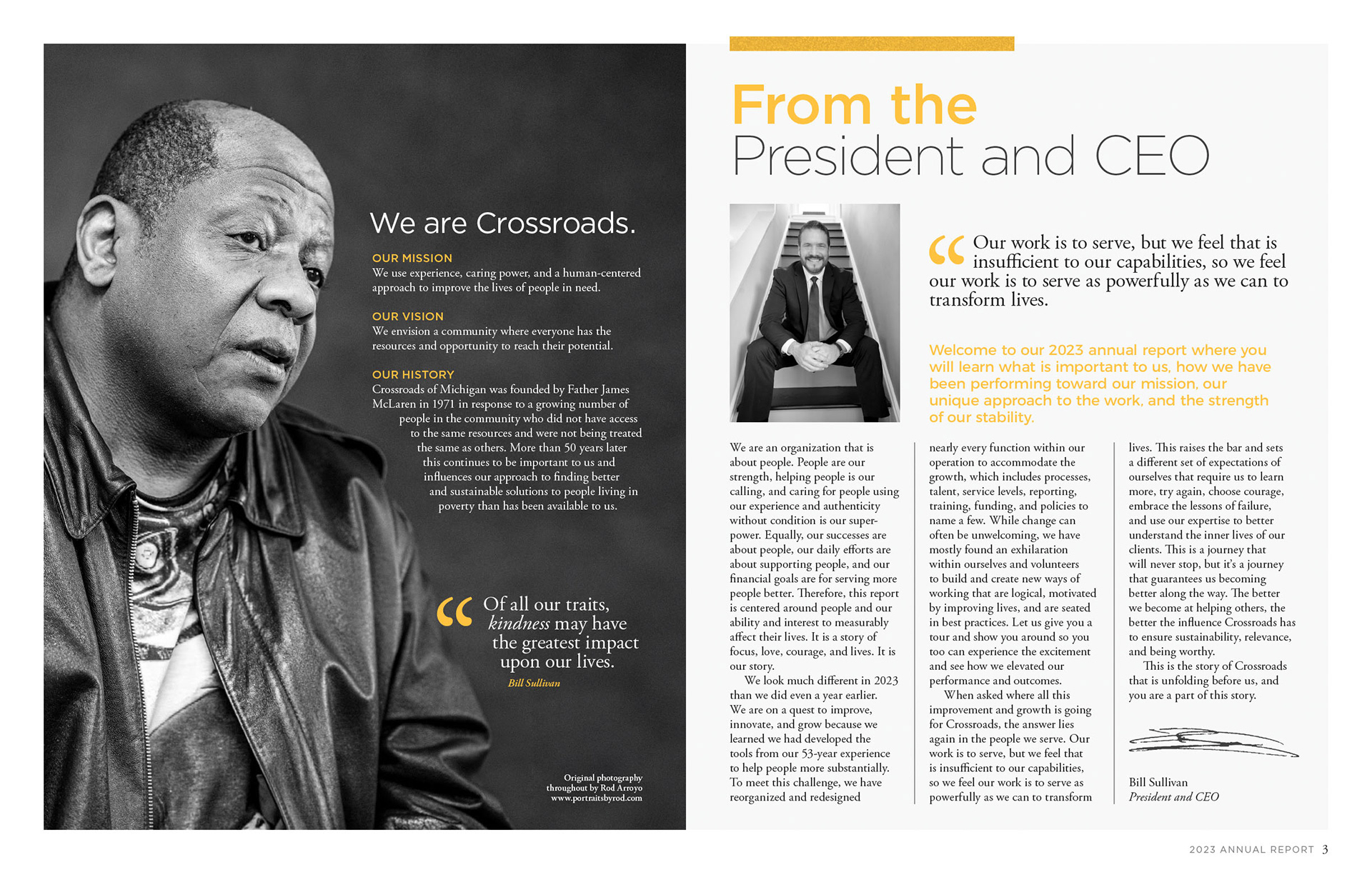 A professional annual report featuring powerful custom photography and metrics-driven storytelling.